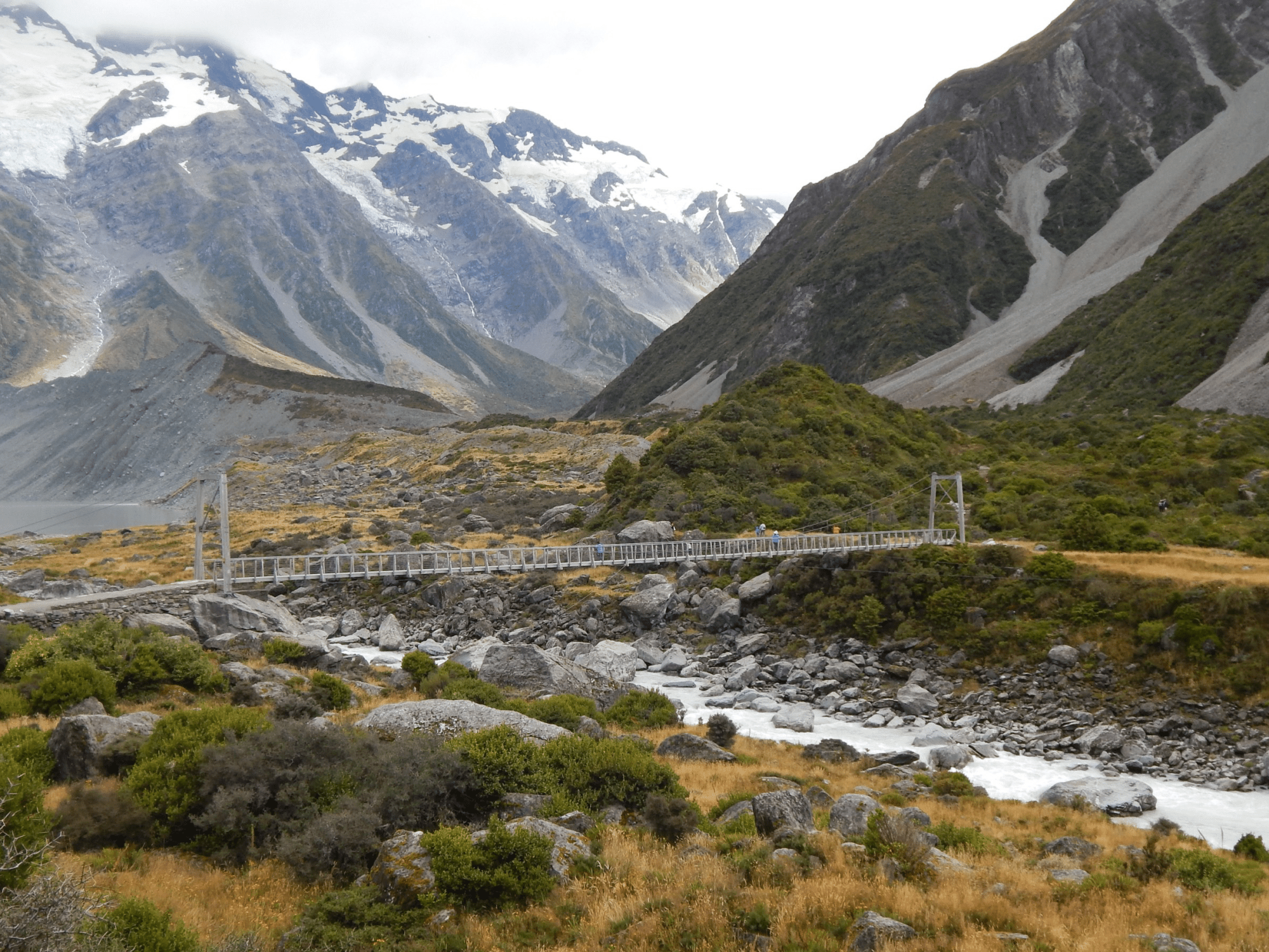 It was the same story for the three days we spent at the Mount Cook Village – a good view of its smaller cousins, and of the lower slopes of the massive mountain itself – except for just 15 minutes as we celebrated Steve’s birthday in the restaurant of the Hermitage Hotel, where we stayed while there. For just 15 minutes on that evening, through the restaurant’s huge viewing window showcasing Aoraki/Mt Cook, the clouds parted, and in the moonlight there stood the whole, huge mountain, in all its white-capped glory, plumes of snow slowly drifting off its peak in the upper-air winds. A wonderful moment I think we will never forget. Unfortunately, all too soon the shy sentinel once again drew closed its curtain of cloud, and we did not see the summit again in our time there. We did however go on several lovely walks, cross fast-moving streams and enjoying the scenery. A very enjoyable and restful few days.
